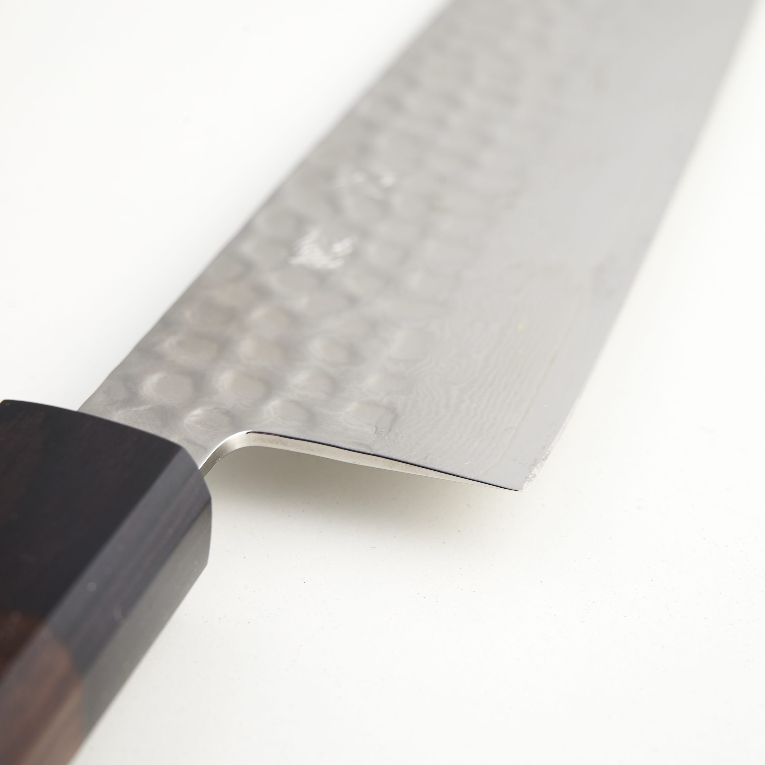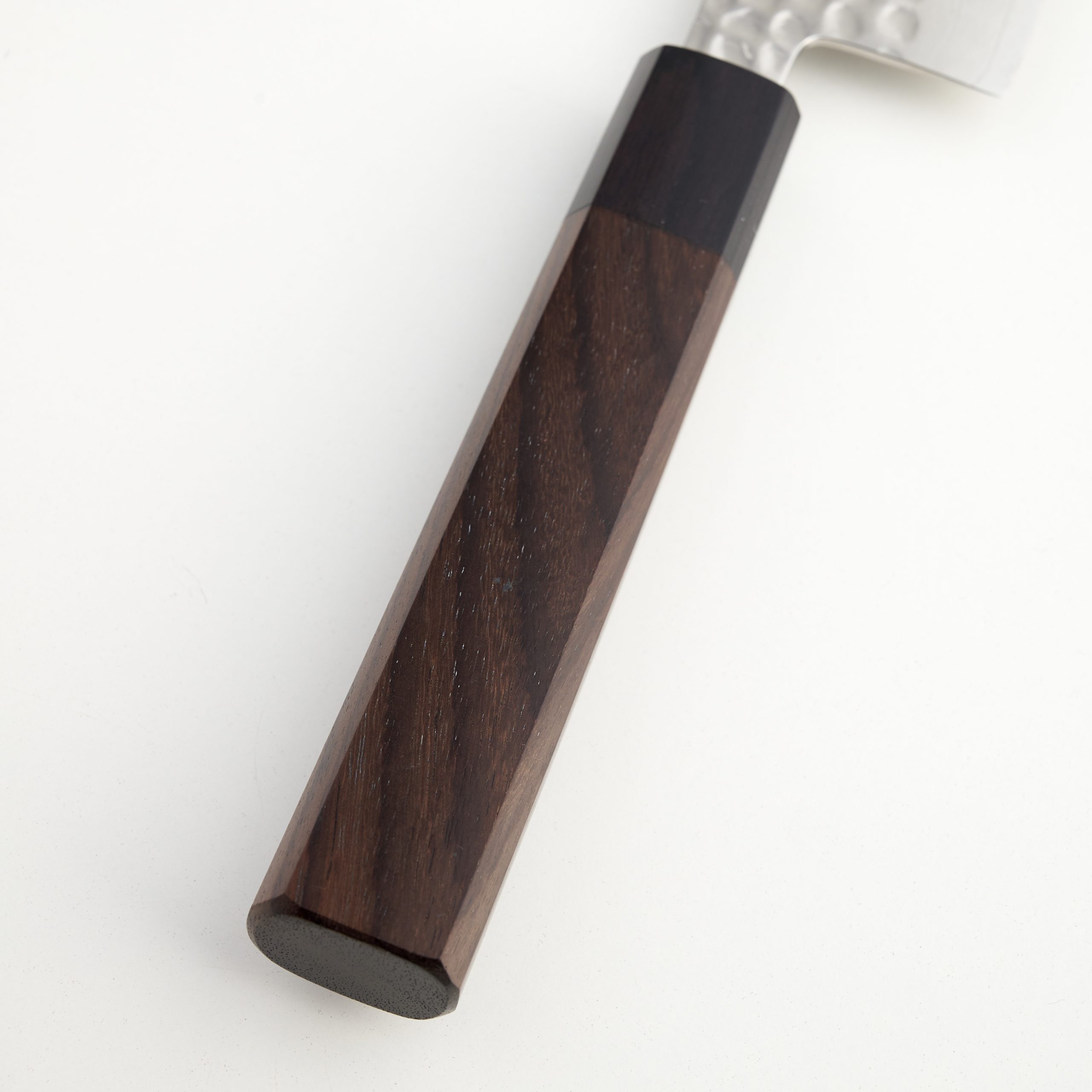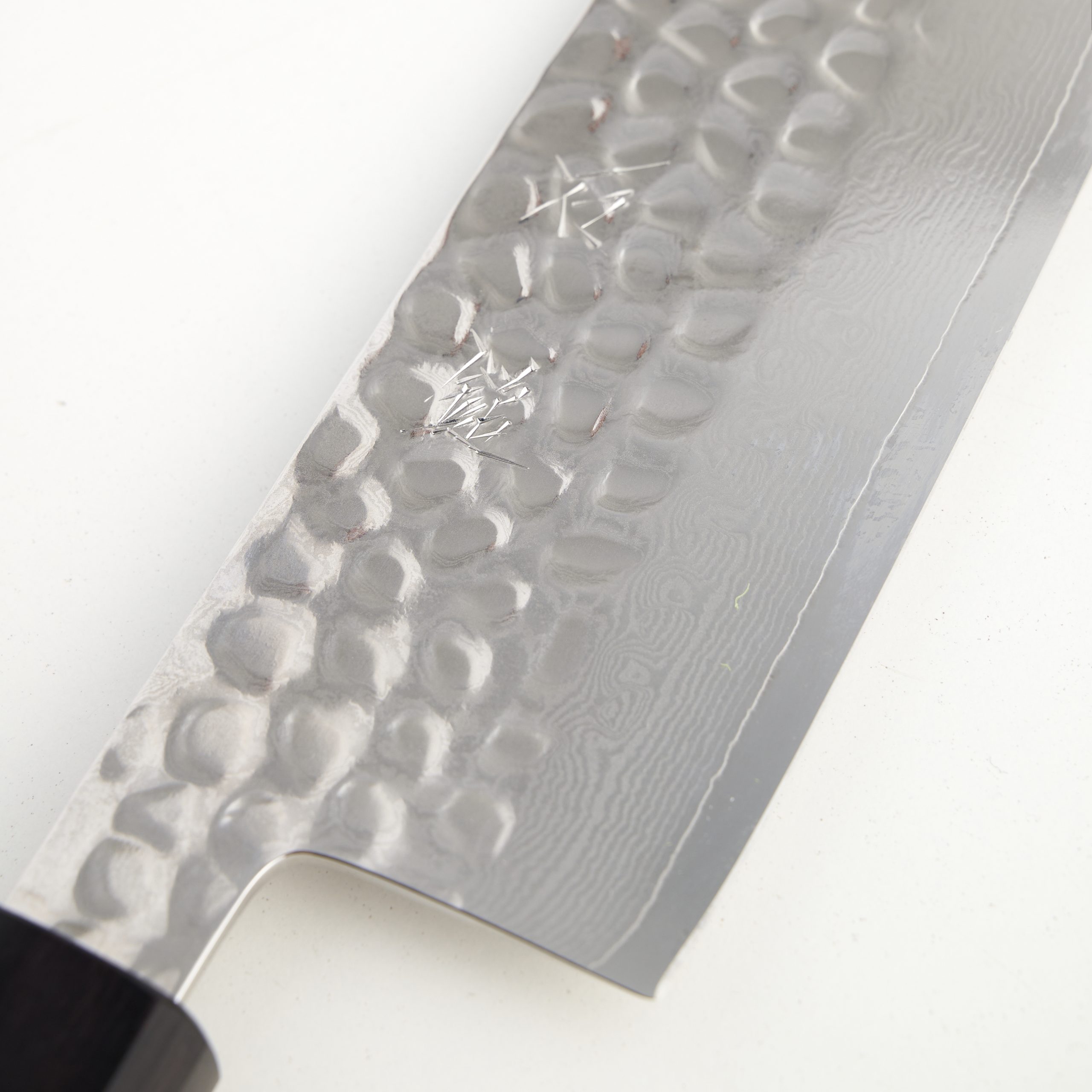 This Ishizuchi Nakiri 165mm, would be the knife of choice for those who love veggies in their everyday home cooking or professional prep. . It is made from VG-10 stainless steel, one of the most loved steels in Japanese knife making, combines two different traditional Hammered / Damascus finishes and is fitted with a beautiful rosewood handle. This knife is a real bargain for its quality and razor sharp out of the box.