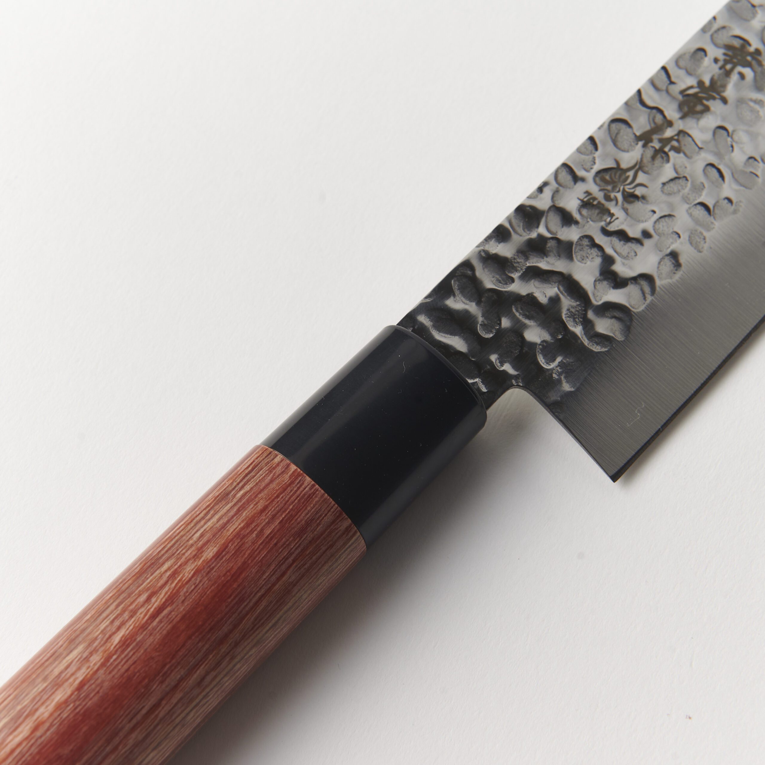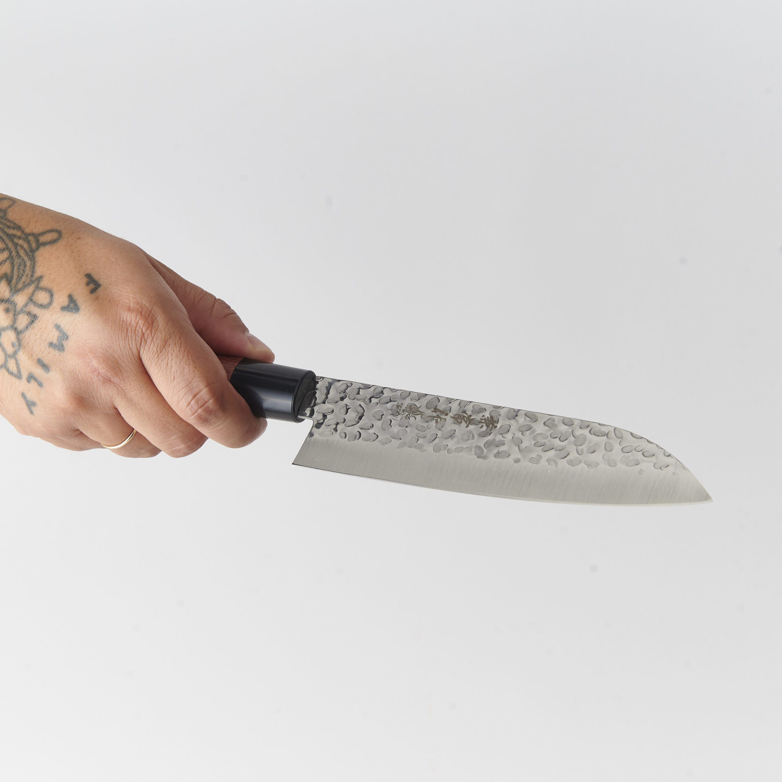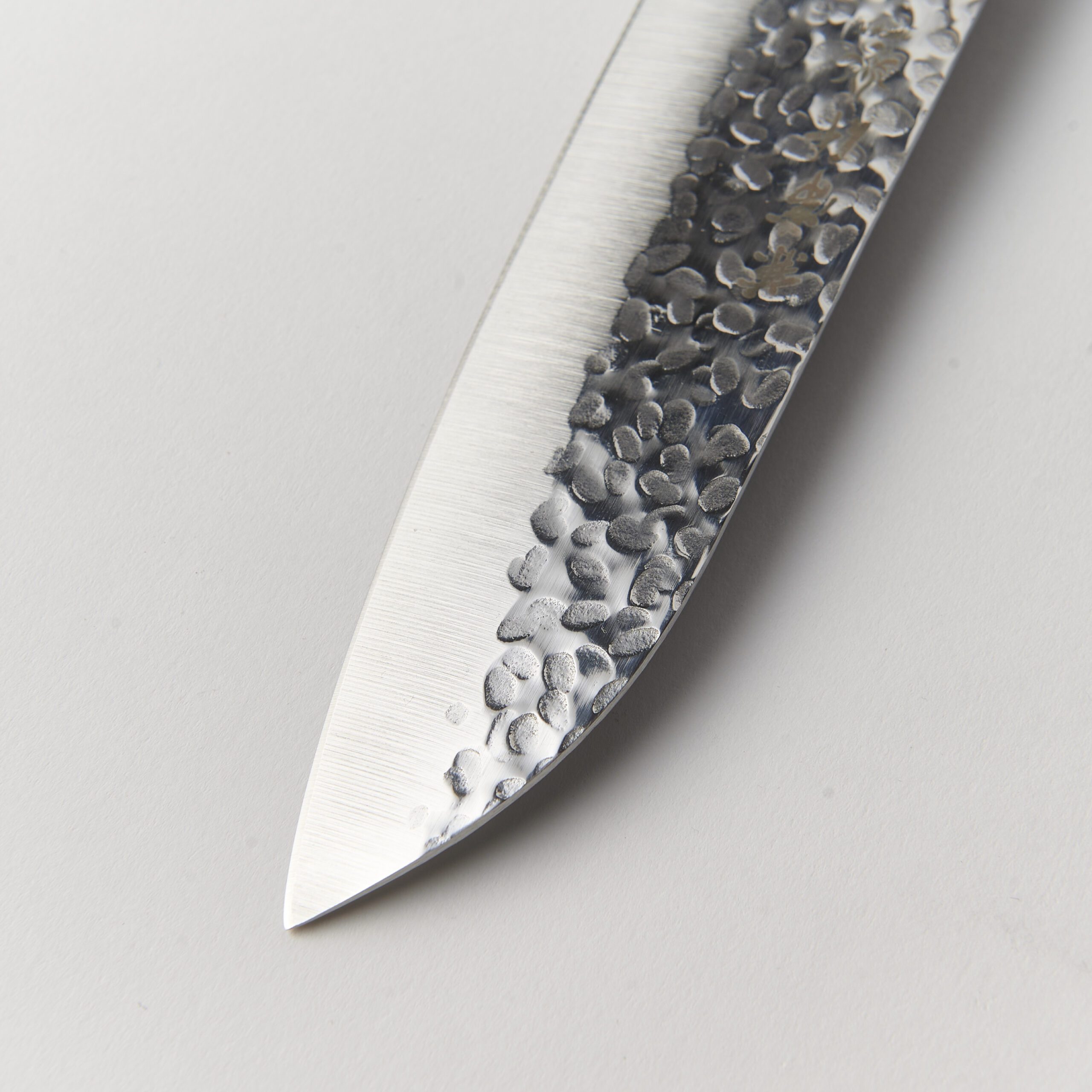 With a tall blade and rounded nose, the Santoku is a versatile, all over, knife that is suitable for cutting meat, fish, or vegetables. The name Santoku means “Three-purpose” (virtues). Used mainly with chopping and push cuts.